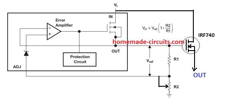输出电压取决于MOSFET栅极通过电位计产生的电压。如果通过电位计的电压增加,栅极电压也将增加,这将导致输出也增加,因此,如果输入电压增加,输出自然也将成比例增加。为了获得固定输出,您可能必须用所需值的齐纳二极管替换pit。
