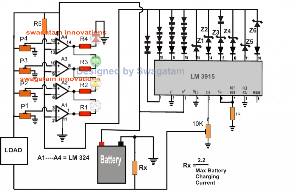 根据负载消耗,相应的输出引脚中的一个LM3915成为有源(逻辑低),这反过来设置所有LM324运放反相引脚的瞬时参考电压水平