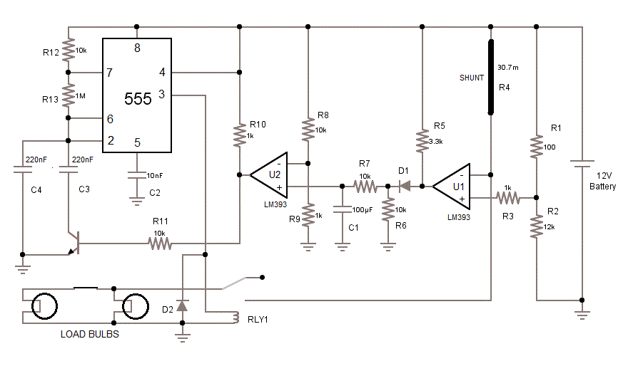 555的输出连接到继电器RLY1,继电器12V直接从电池(通过分流)到灯。