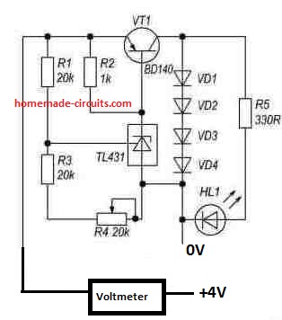 In the above diagram most of the parts placement is similar to the first shunt regulator design, except that here the cathode is provided with a resistor to positive and the point also becomes the base trigger of the connected buffer transistor.