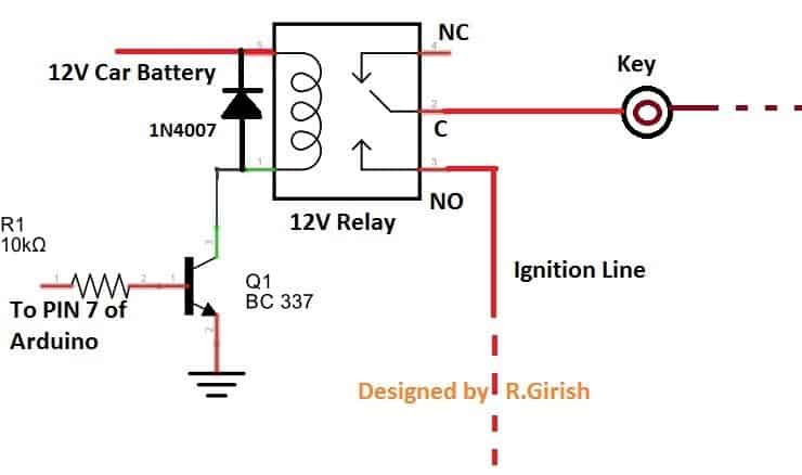 Few relays interfaced with Arduino board enables and disabled the ignition and central lock of the car.