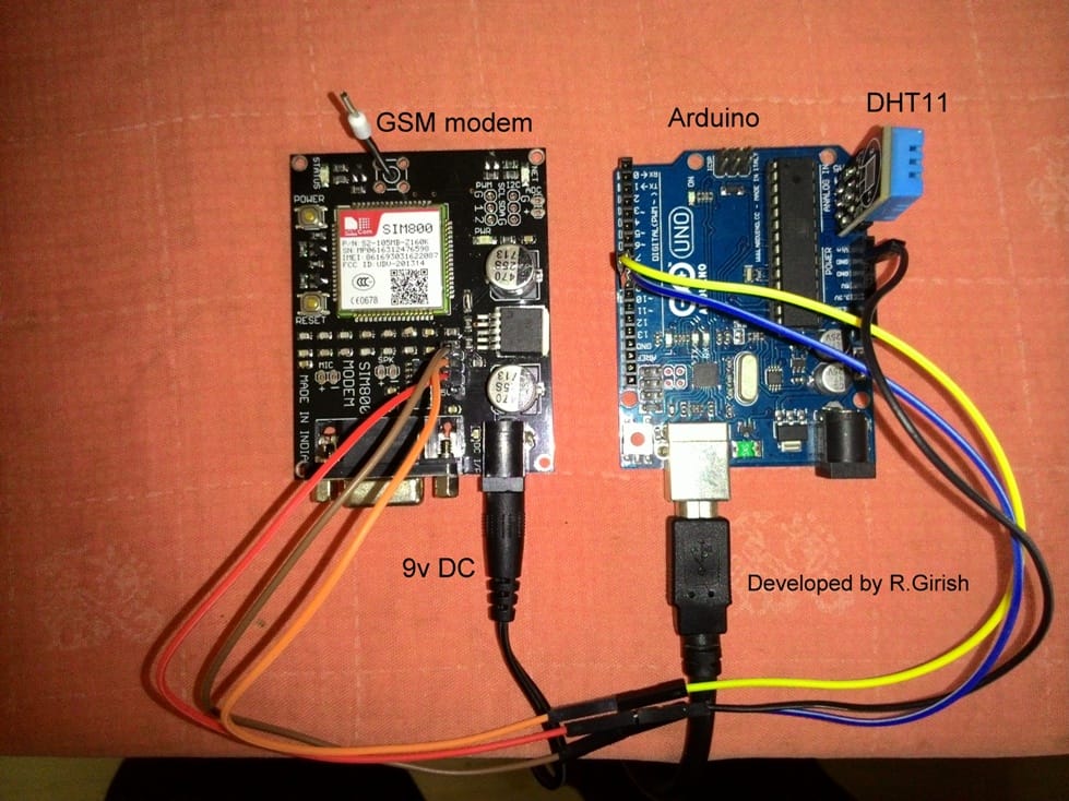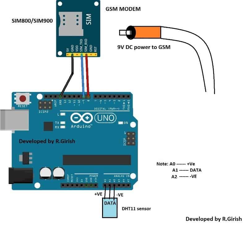 The wiring of the setup is same as otherGSM based projectswhich was discussed in this website. The only difference is the addition of DHT11 sensor to Arduino.
