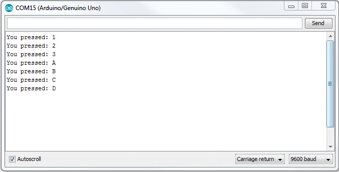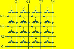 它被称为4x4,因为它有4行4列,以矩阵形式排列。它有从0到9的数字,特殊字符“#”和“*”,以及从A到d的字母。还有其他类型的键盘,如4x3, 8x8等。最常见的是4x4和4x3。