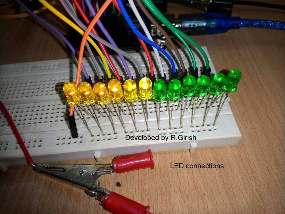 这将给传感器足够的时间预热;我们可以看到arduino在串行监视器中执行的一些动作。当传感器达到最佳温度时,arduino将读数发送到串行监视器。根据这些读数,led灯会开关。串行显示器上显示的值越高,打开的led数量就越多。