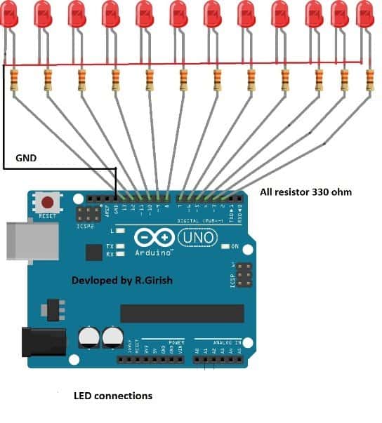 它从LED测试开始,每个LED按顺序打开,有一定的延迟,用户可以判断LED连接错误,例如未连接的LED和未按顺序排序的LED。程序停止5分钟,所有的led灯同时发光。