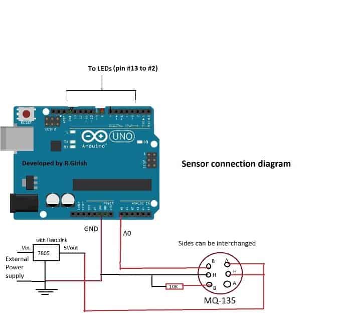 上面的原理图说明了如何将传感器连接到arduino上。该传感器的加热线圈采用外部电源供电。传感器的侧面可以互换。