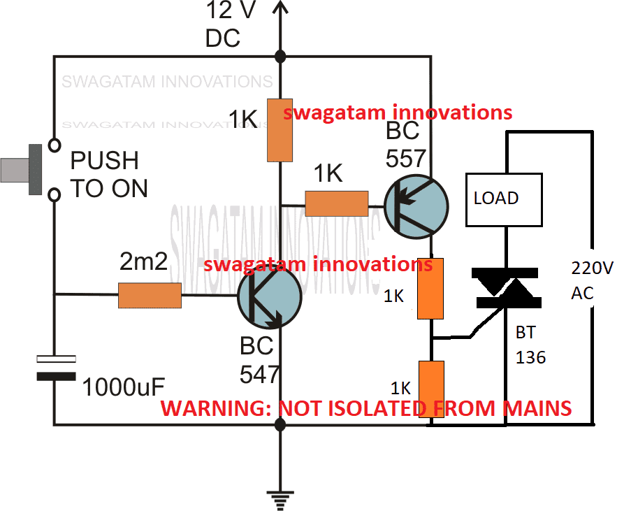 释放按钮时,由于在100 UF电容器内部充电的存储器的存在,晶体管和TRIAC以及灯都会继续打开,这使BJTS底座使前进偏置。