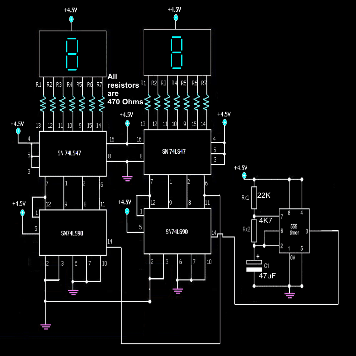 每个显示器上的电阻R1到R7被连接来限制显示led的电流,以保持恒定的照明,也为保护显示led免受损坏。