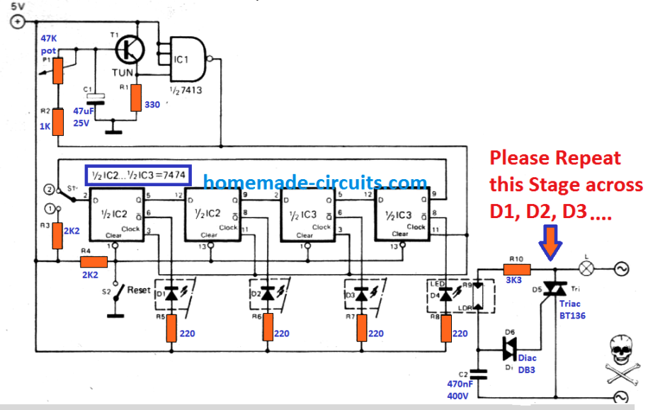 The above outputs can be either connected with LEDs for acquiring an illuminated chasing effect or can be terminated with triacs for driving 220 V mains operated lamps or incandescent bulbs in the same fashion, as shown in the diagram below.