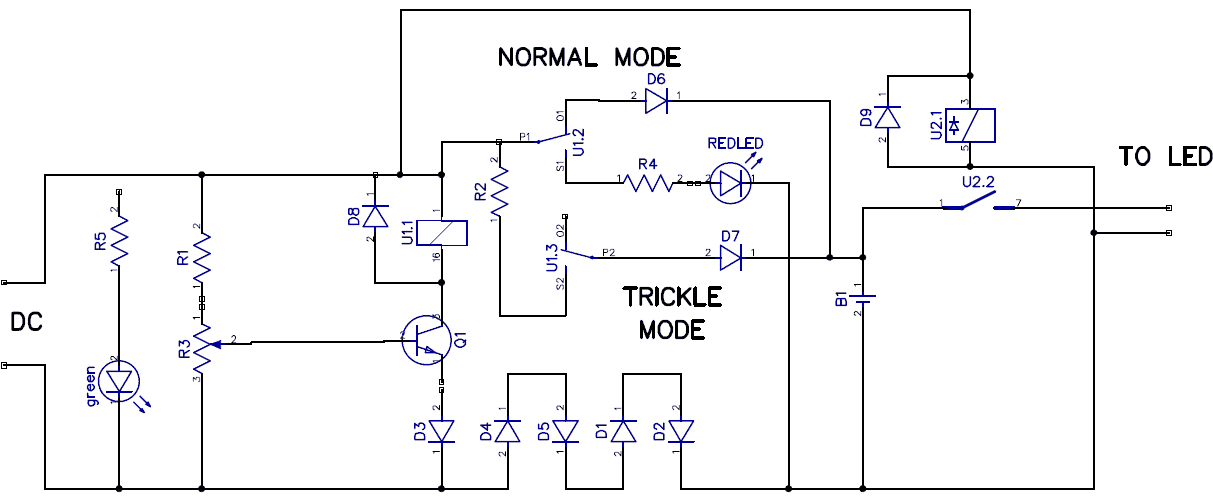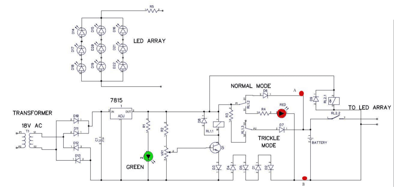 Vinod: I made the charger (hysteresis) but there is a problem. i will attach the image to explain the problem. When i connect multimeter in that particular red dots, the voltage shows 16.8.(0.43 A) but when i disconnect battery from the charger and measured again. then there is no problem. the out put is 14.2. And the other pin of the relay(through the current limiting resistor) will deliver a clean output voltage of 13.9 (0.033A). Why this is happening ?. The only change i have made from this circuit is to grab the green LED and R1 from there and connect it after the D6.