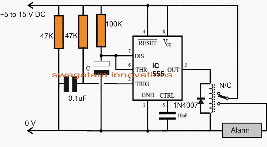继电器或IC输出的ON周期由100k电阻和电容C的值决定。C的不同值可以在10uF和100uF之间尝试,以达到最接近的5到10秒的持续时间。