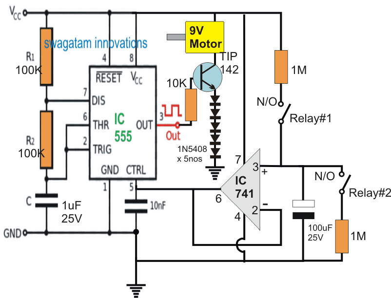 以IC 741形式的电压跟随器配置IC 555的控制引脚5,以便根据指示的继电器操作改变IC 555引脚3处的PWM内容。