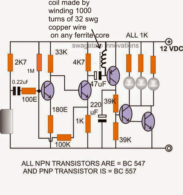 该级通常包括一个声音传感器级,由一个麦克风和随后使用一对BC547晶体管的晶体管放大器级组成。