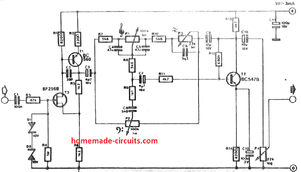 音调控制通常包括低音和高音功能,用于调整音乐的动态质量。然而,由于音调控制也有能力放大传入,它可以有效地像一个优秀的Hi-Fi前置放大器电路stage。我们有一个两种工作方式的系统,既提高音乐的音质,也为随后的功率放大阶段预先放大音乐。
