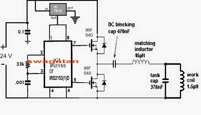 The circuit is driven from a 24 V DC supply, at current ranging up to 15 amps. A 7812 voltage regulator drops the input voltage to 12V for the driver IC which is a standard half bridge driver IC IRS2153 or any other similar.